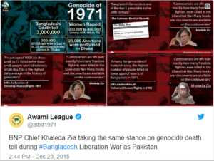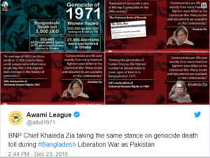 খালেদা জিয়ার এই বক্তব্যের সমালোচনা করেছে আওয়ামী লীগ৷ দলটির টুইটার অ্যাকাউন্ট থেকে চারটি ছবি সহ একটি টুইট করা হয়েছে৷ ছবিগুলোতে মুক্তিযুদ্ধের সময় শহিদের সংখ্যা নিয়ে কোথায়, কী বলা হয়েছে সেগুলো উপস্থাপন করা হয়েছে৷ আওয়ামী লীগ মনে করছে, শহিদের সংখ্যা নিয়ে পাকিস্তানের যে অবস্থান, খালেদাও সেই অবস্থান নিয়েছেন৷