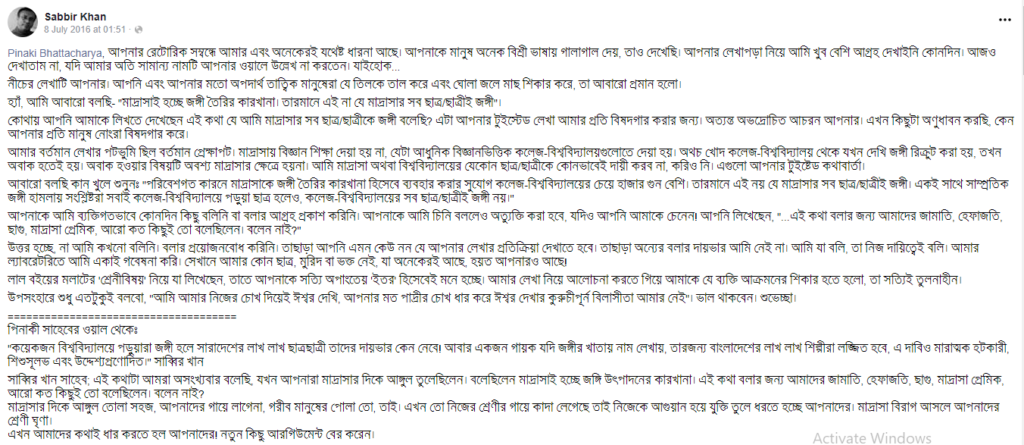 উনি আমাকে প্রশ্ন করেছেন, “কোথায় আপনি আমাকে লিখতে দেখেছেন এই কথা যে আমি মাদ্রাসার সব ছাত্র/ছাত্রীকে জঙ্গী বলেছি? এটা আপনার টুইস্টেড লেখা আমার প্রতি বিষদগার করার জন্য। অত্যন্ত অভদ্রোচিত আচরন আপনার। এখন কিছুটা অণুধাবন করছি, কেন আপনার প্রতি মানুষ নোংরা বিষদগার করে।”