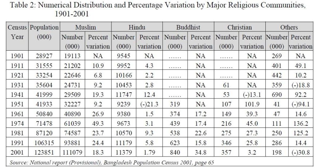 ২/ হিন্দু জনগোষ্ঠীর প্রজনন হার কম। ১৯০১ সাল থেকে হিন্দুদের প্রজনন হার মুলত ২-৫ শতাংশ। ১৯৪১ সালেই তা একবার ১০% এর উপরে উঠেছিল। মুসলমানদের প্রজনন হার ১৯৪৭ এর পর থেকেই ২০% এর উপরে। অবাক করা বিষয় হচ্ছে বাংলাদেশে খ্রিস্টান এবং বৌদ্ধ সম্প্রদায়ের সংখ্যা বাড়ছে। এমনকি শেষ সেনসাসে বৌদ্ধ জনগোষ্ঠী মুসলমানদের চাইতে প্রায় দ্বিগুণ বেড়েছে। ধর্মীয় নির্যাতনই যদি জনসংখ্যা কমার একমাত্র কারণ হতো তাহলে বৌদ্ধ এবং খ্রিষ্টান জনসংখ্যা বাড়ার কোন কারণ ছিলোনা।