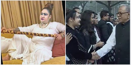 She is Shamima Noor Papia, alias Piu. She is a senior leader of Jubo Mahila League, the female youth wing of the ruling Awami League party in Bangladesh. In one photo she is shaking hand with the President of Bangladesh, in a state function. In the other, she is sitting in a commanding posture with a stick in his hand, ready to beat up or force unwilling girls to sexually entertain her clients – exactly the way we see the brothel runners torture girls in the Bollywood movies.