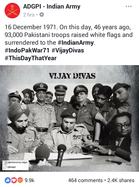কিছুদিন আগে মুক্তিযুদ্ধ নিয়ে বিতর্কিত তথ্য থাকায় পাকিস্তান এমব্যাসিকে তার সাইট থেকে তথ্য সরিয়ে নিতে বাধ্য করেছিল বাংলাদেশ সরকার। এবার ইন্ডিয়ান আর্মি ঐতিহাসিক তথ্য বিকৃত করলো। পাকিস্তানের পুর্বাঞ্চলিয় কমান্ড ইন্ডিয়ান আর্মির কাছে নয় ভারত বাংলাদেশ যৌথ বাহিনীর কাছে আত্মসপমর্পন করেছিল।