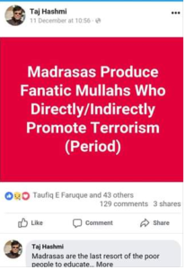 This Western-educated gentleman is a modernist, but he speaks on the line of a theologian. He can never present the evidence of a case in which any madrassa was found giving any lesson on terrorism to its students. His message reflects hatred against a class. One educated so-called elite is spewing animosity against a poor class. How will this gentleman face the situation if the madrassa-educated people ask how he has become an Islam-baiter despite receiving modern education?