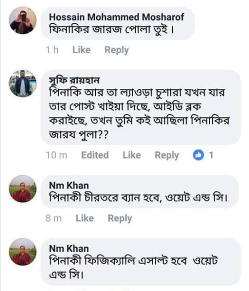 সদ্য ফেবুতে প্রকাশ্য প্লাটফর্মে দেয়া একটি হুমকি আমার নজরে এনেছেন আমার একজন ফেবু বন্ধু। এই হুমকি দিয়েছেন NM Khan, যার পুরো নাম নুরুল মোমিন খান। তিনি ঢাকাতেই থাকেন এবং পেশায় ডাক্তার। এই মধ্যবয়সী ডাক্তার প্রকাশ্যেই বলছে “পিনাকী চিরতরে ব্যান হবে” এর অর্থ পিনাকীকে মেরে ফেলা হবে।