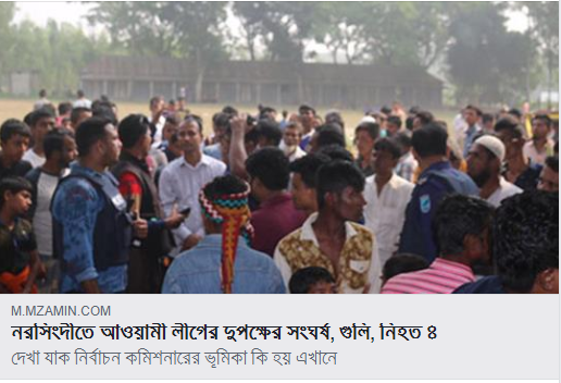 নির্বাচনের তফসিল ঘোষনার পরে আওয়ামী লীগের দলীয় সন্ত্রাসের বলি হল ছয়জন​​। ​আওয়ামী লীগের দুই প্রার্থীর মনোনয়ন ফর্ম নেবার শো-ডাউনের মিছিল মুখোমুখি হলে ​গত সপ্তাহে ​ঢাকার মোহাম্মদপুরে সংঘর্ষ হয়। সেই সংঘর্ষে নিহত হয় বাকী দুই জন​​। পুলিশের মতে নরসিংদীতে এই দলীয় সন্ত্রাসে মৃতের সংখ্যা এ পর্যন্ত তিন হলেও, কিছু মিডিয়া রিপোর্টে এই সংখ্যা চার।