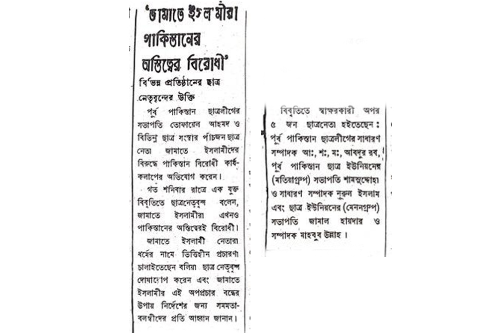 “Tofayel Ahmed, president of East Pakistan Chhatroleague and five student leaders from different student organisations have charged that Jamaat e Islami is involved in anti-Pakistan activities. In a joint statement last Saturday the students said, Jamaat e Islami continues to be against the existence of Pakistan,” the statement said.