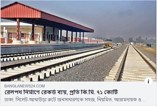 সিলেট-আখাউড়া রেলপথ নির্মাণ প্রসঙ্গে এই খবরটা দেখুন। প্রতি কিলোমিটার রেলপথ নির্মানে ৭১ কোটি টাকার বেশি ব্যয় হচ্ছে এখন। অথচ এই বাংলাদেশেই প্রতি কিলোমিটারে একই সময়ে পৌনে নয় কোটি টাকা খরচ হয়েছে।