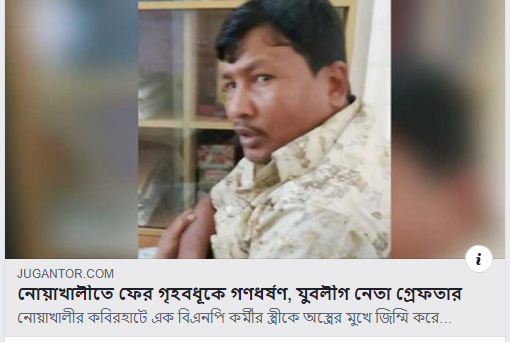 আওয়ামী লীগের কর্মীরা বিরোধী দলের কর্মী সমর্থকদের পরিবারের নারীদের ধর্ষণ করা শুরু করেছে। এর আগে এই নোয়াখালিতেই এক গৃহবধূকে ধানের শীষে ভোট দেয়ার “অপরাধে” আওয়ামী লীগের কর্মীরা দঙ্গল ধর্ষণ করেছিলো।